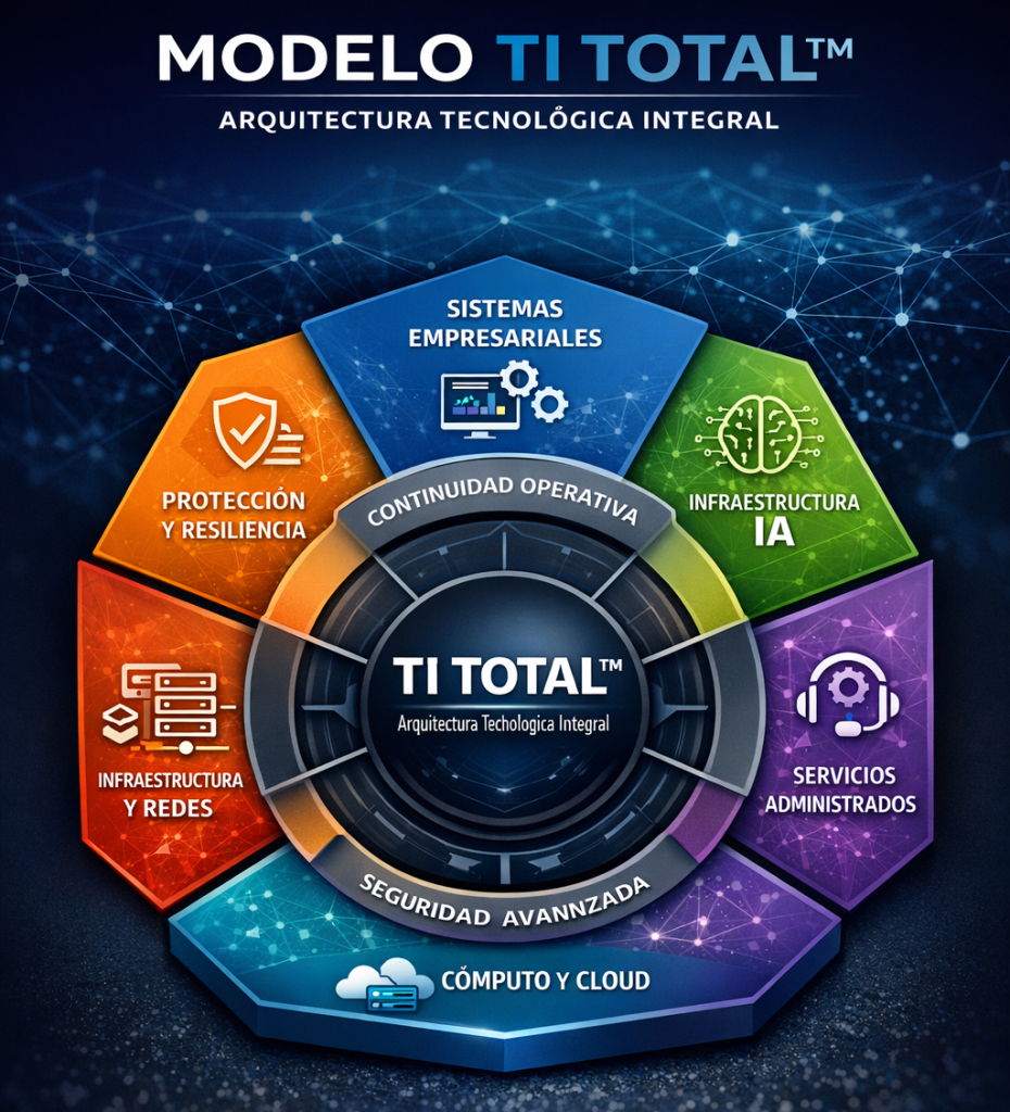Para resolver este problema, en ARTECK MX desarrollamos el modelo TI Total™, una arquitectura tecnológica que organiza la infraestructura empresarial como un sistema completo.